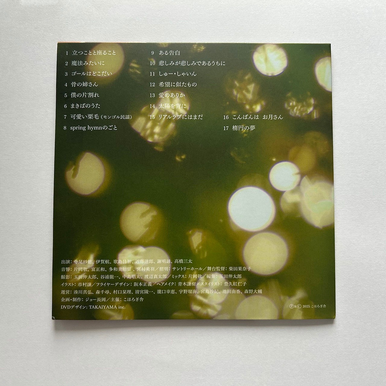 立つことと座ること/魔法みたいに /ゴールはどこだい /骨の姉さん /僕の片割れ /まきばのうた /可愛い栗毛 (モンゴル民謡) /spring hymnのごと /ある告白 /悲しみが悲しみであるうちに /しゅー・しゃいん /希望に似たもの /愛のありか /太陽を背に /リアルラブにはまだ /こんばんは お月さん/楕円の夢